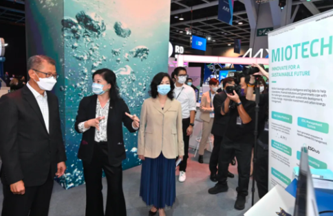 由香港金管局與投資推廣署合辦的「香港金融科技周2021」11月3日開鑼,財政司司長陳茂波當日早上出席香港金融科技周2021。圖為陳茂波(左一)和財經事務及庫務局常任秘書長(財經事務)甄美薇(左三)參觀展覽攤位。