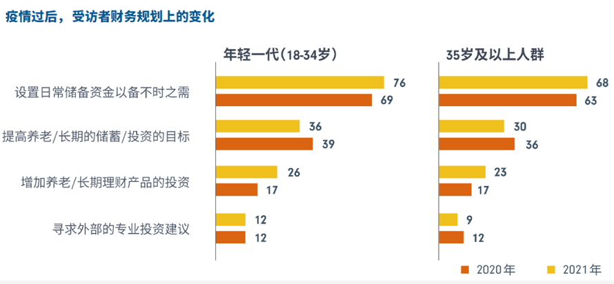 疫情過後,年輕一代和35歲以上人群,都會把日常儲備的資金額度增加,以備不時之需,同時也希望加大養老和長期理財產品的投資,不過對於養老儲蓄投資的目標,則是有降低了——估摸著是今年股市裏虧了不少錢,被市場教育了一番,認清現實了吧?