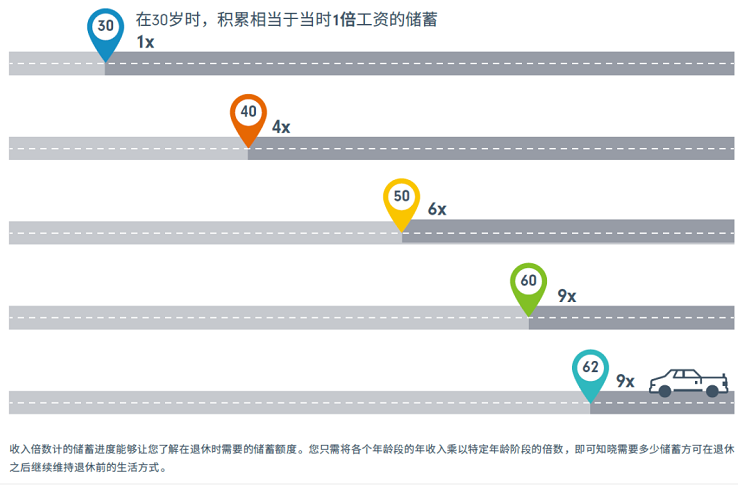 比方說,在30歲時,我們目標要讓養老儲蓄積累到當時年收入的1倍。在40歲時,我們的養老儲蓄總額應該要達到當時年收入的4倍,以此類推。