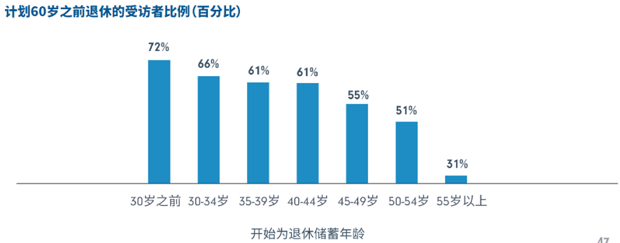 對於希望能夠在60歲之前退休的受訪者而言,更是要在40歲之前,就認真開始儲蓄,否則就是不得不延遲退休。