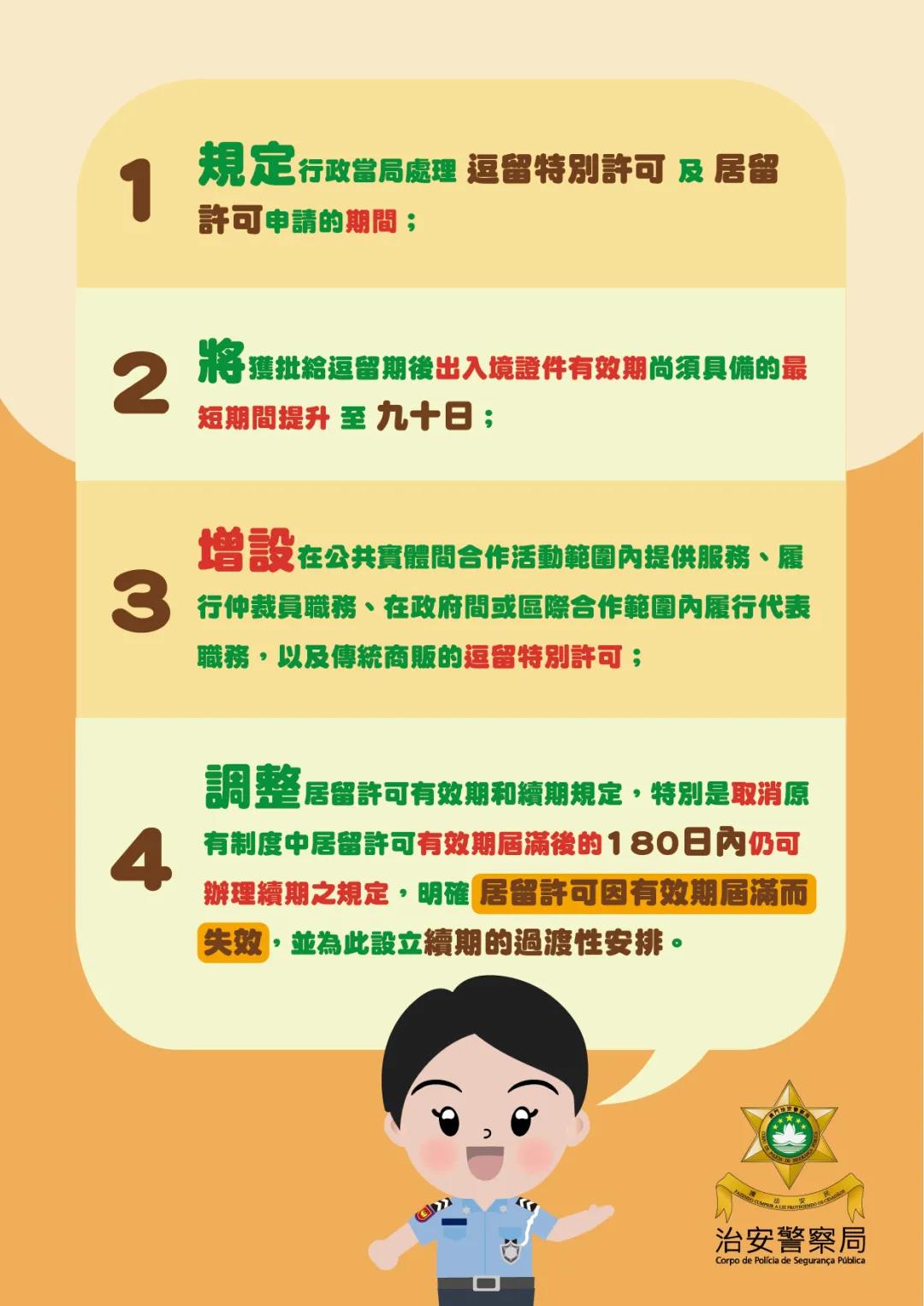 就新法的重點修改內容,以及出入境、逗留及居留方面的相關規範和行政手續,治安警察局將適時作進一步公佈。