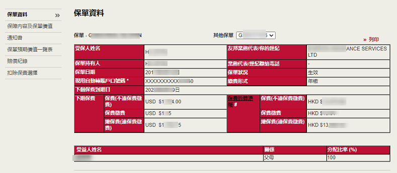 友邦的後臺可以查詢保單的基本資訊、帳戶現金價值、自動轉賬及入賬的銀行帳戶、保單受益人資訊、聯繫資料等等。