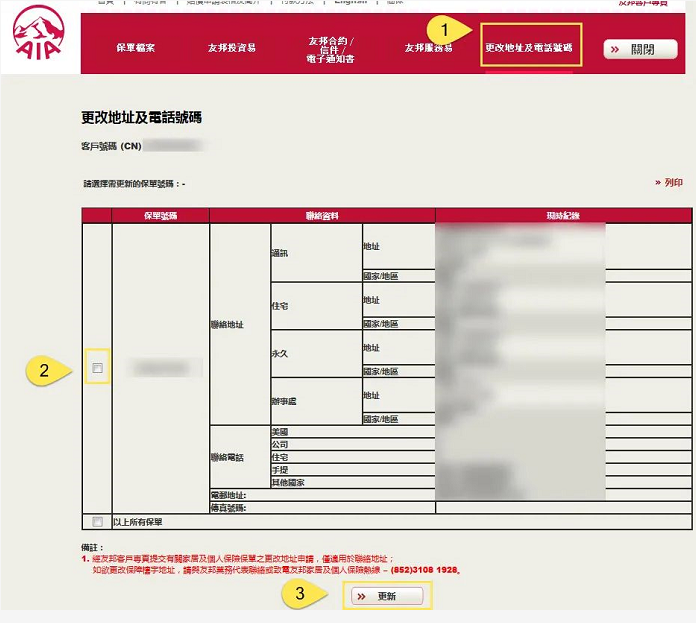 進入「客戶專頁」後,點擊「更改地址及電話號碼」、勾選所要修改的保單,點擊「更新」。