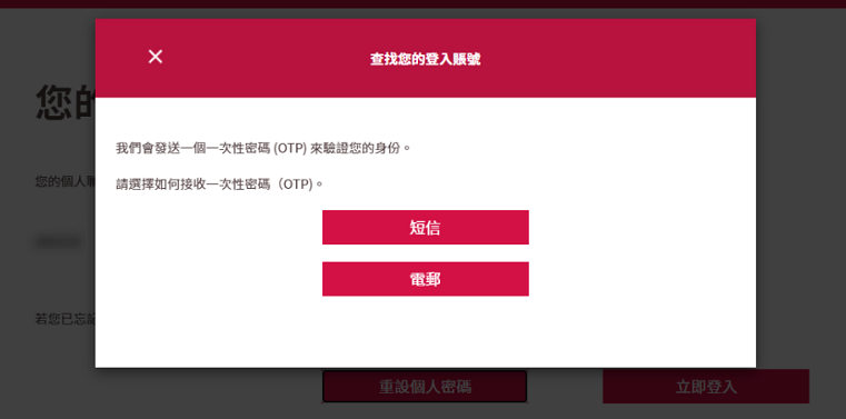 客戶可以選擇「短信」或者「電郵」的方式,來收取一次性密碼驗證身份。