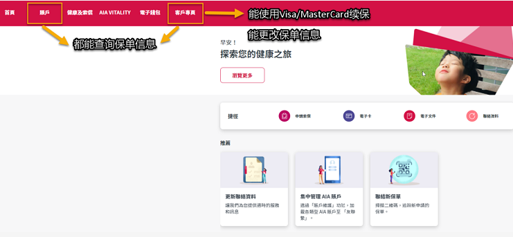 點擊「客戶專頁」:可查詢、更改保單資訊,能使用Visa/MasterCard續交保費。