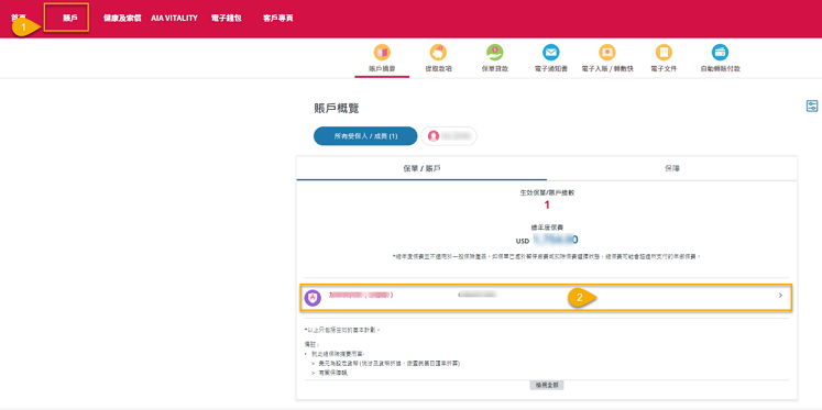若是點擊「帳戶」,進行查詢,則點擊圖中步驟2的保單名稱及保單號這一欄進行查看。