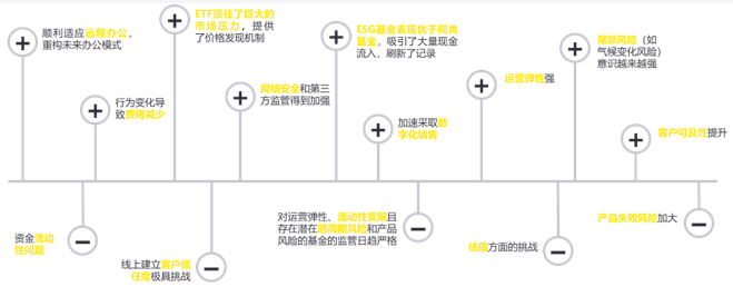 在這一背景下,2020年新冠疫情的爆發,不僅擾亂了金融市場,更暴露了資產管理行業的弱點,在加速了該行業的結構性轉型的同時,引發了新的問題。對此,資產管理公司迅速作出回應,維持了運營彈性,打消了客戶疑慮,轉向了遠程辦公。
