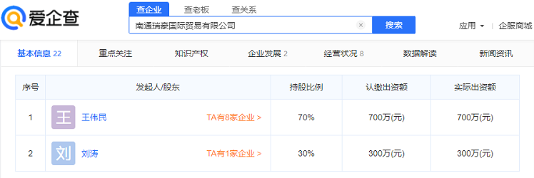 愛企查顯示,質押擔保方南通瑞豪國際貿易有限公司成立於2014年,目前有兩名個人股東王偉民和劉濤,分別持股70%和30%。