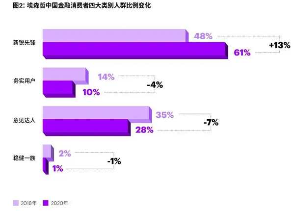 他們樂於通過數位化管道及移動終端與金融服務提供商展開互動。在這次的調研中,新銳先鋒是比例最大的群體,佔據總客戶群體的61%。