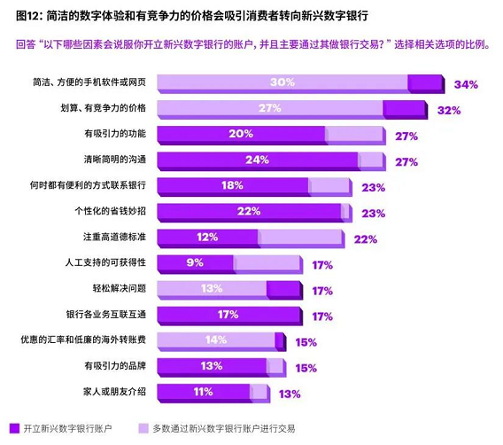調研數據表明消費者選擇新興數字銀行的主要原因並非是其個性化的產品或是有吸引力的品 牌,而是其簡潔介面、功能便利及價格優勢。傳統銀行應該在這些方面取其所長,憑藉消費者對傳統銀行的高信任度,結合自身在綜合金融服務的優勢,在數字時代加快業務重塑、再續輝煌。同時,上述調研數據也表明在數字經濟時代下,消費者對銀行產品和服務的挑選標準趨於理性——快速便捷地滿足自身財富管理的需求更為重要。