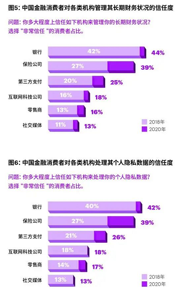 此次調研還發現,在中國消費者心目中,銀行在眾多機構中仍是大眾最為信任的金融服務提供商,甚至在疫情過後,“非常信任”銀行的受訪者比例還較2018年有小幅上升。