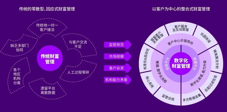 全民理財時代,財富管理行業競爭白熱化,商業銀行、保險、信託、券商、基金公司、第三方財富管理 機構、金融科技公司群雄逐鹿。同時,中國資本市場正在加速開放,全球領先的財富和資產管理公司變得更加活躍,並引入領先的數字思維方式。激烈的競爭給國內銀行帶來轉型壓力,其傳統的理財業務正在向智能化、綜合化的財富管理轉型。