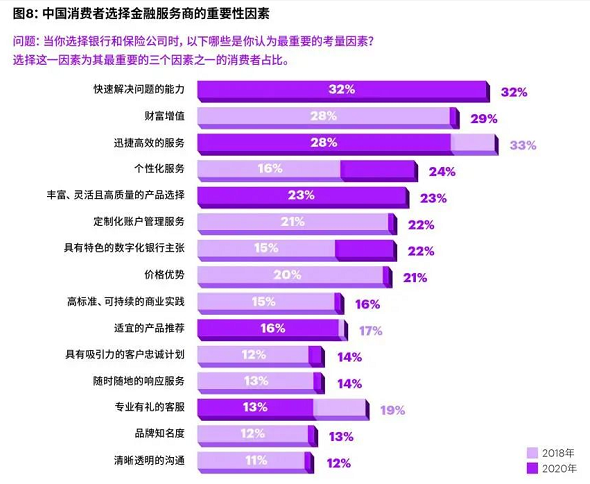 隨著消費者與銀行數字互動的深化,消費者對銀行服務的效率更為看重。此次調研顯示,“提供快速解決問題的能力”是中國消費者選擇金融機構的首要標準。同時,“財富增值”已成為中國金融消費者選擇金融機構的第二重要因素。這或許是因為疫情對整體經濟的衝擊,消費者更重視個人財富的保值和增值。