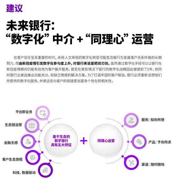 也正是因為關注數位化和關注人本身在後疫情時代變得同樣重要,埃森哲主張提出“同理心銀行” 概念,建議銀行在數位化和人文需求之間尋找並達成平衡點,通過“隨時隨地的管道”提供“予你所求的產品”和“知你所想的服務”。