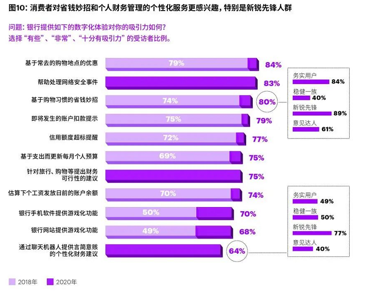 雖然消費者更注重性價比,很有可能是受疫情衝擊下的經濟不景氣而導致的短時現象,但這並不意味著銀行可以視若無睹、被動依賴消費自身消解對價格的敏感性,相反銀行應該主動出擊、有所作為,展現其在長期管理客戶財富的專業能力,並為客戶提供體驗優、反應快的個性化解決方案。例如,基於購物習慣的省錢妙招就受到八成消費者的鍾愛,特別是新銳先鋒群體對個性化方案最有興趣。