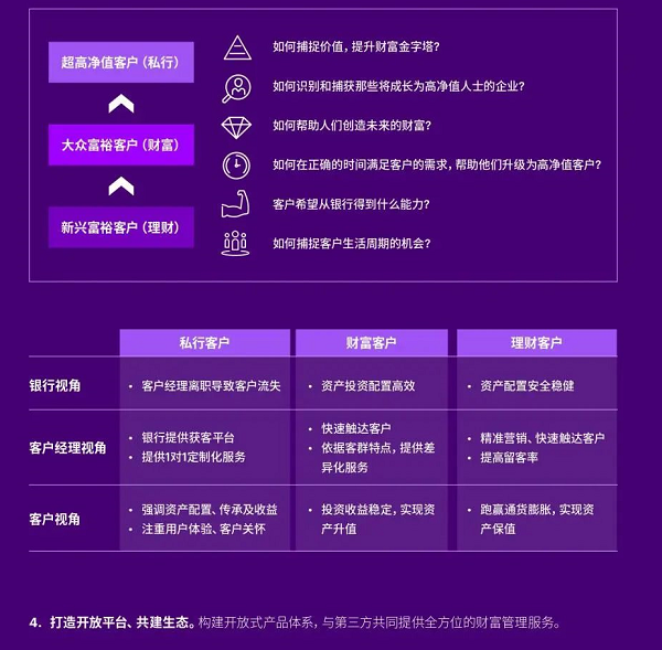 3.精准客群分層、打造獨特價值主張。結合銀行自身的客戶群體,精准切分並與之匹配差異化的產品、渠 道、行銷和服務。通過多視角關注點分析,致力於針對不同客群提供一站式財富管理解決方案。