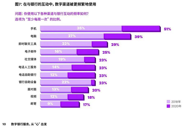 2020年新冠肺炎疫情爆發期間,中國消費者更頻繁地使用數字管道與銀行互動,而且這種趨勢在後疫情時代仍在加強。埃森哲調研顯示,相比2018年,更多比例的受訪者至少一週一次與銀行互動,特別是通過數字管道(見圖7),高達51% 的受訪者表示每週會通過手機與銀行互動至少一次,遠高於2018年的35%。