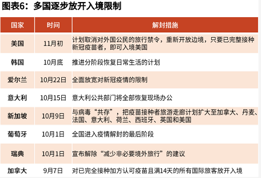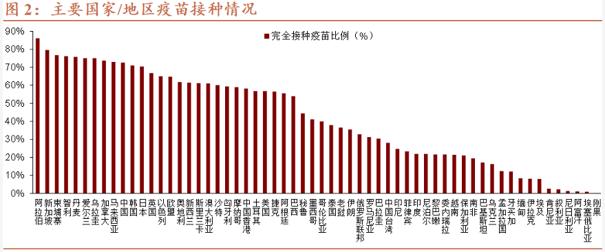 隨著疫苗的普及,2022年疫情對全球範圍內經濟活動的制約趨勢上是下降,預計有更多經濟體重啟經濟、開放邊境、選擇與疫情共存的模式。今年10-11月,疫苗接種進度領先的多國已宣佈實行新的重新開放計畫。