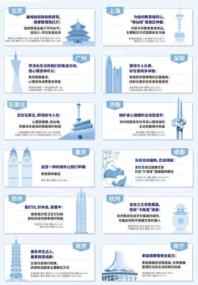此外,調研發現,北京家庭加班熬夜比例顯著高於總體平均水準;相較於其他家庭,北上家庭“懶癌”比例高;杭州家庭對不健康食品的抵抗力最強;京滬兩地家庭更多感受到家庭經濟負擔重;廣州家庭更多感受到家庭財務管理的難處;鄭州家庭備受心理亞健康和經濟壓力重的困擾。