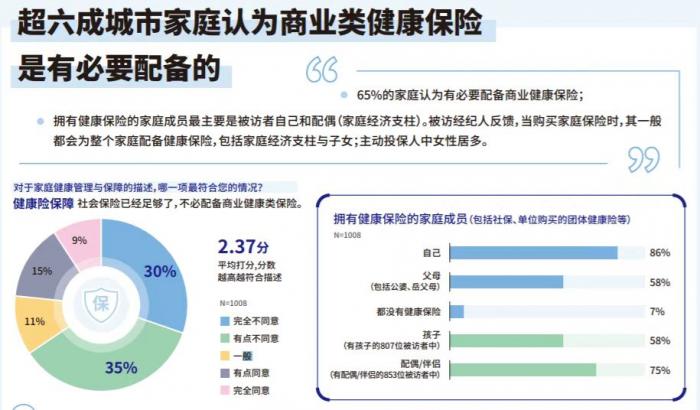 調研結果顯示, 65%的受訪家庭認為有必要配備商業健康保險,82%的家庭認為保障是健康險的基礎,健康增值服務更重要;75%的受訪者表示在需要時會積極與心理諮詢師溝通;約九成受訪者願意接受線上就醫,購買過基礎或商業保險的受訪者對數字化醫療服務的意願度更高;超過40%的職場女性對家庭健康管理非常自信,但自信程度低於非職場女性。