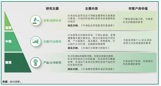 提供專業的社會責任洞察研究報告,提升客戶對社會責任的瞭解並激發其踐行社會責任的意識;社會責任研究能力可分為宏觀、中觀、微觀三個層次,具體可包括:宏觀一政策與趨勢研究;中觀一主題與行業研究;微觀ー產品與公司研究。