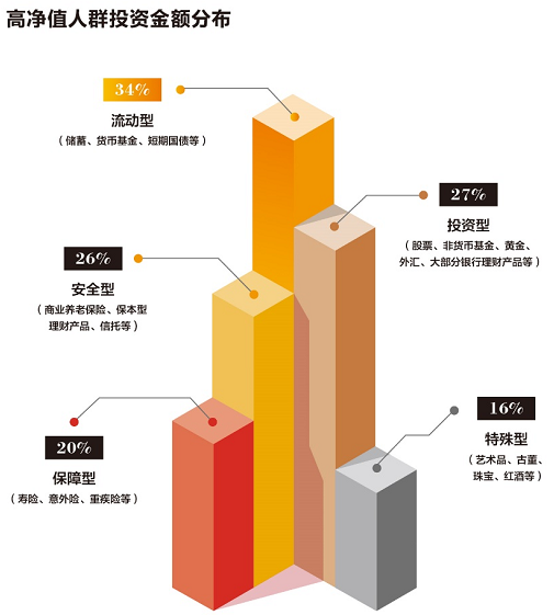 從投資者人數比例來看,93%高淨值人群進行了包括儲蓄、貨幣基金、短期國債在內的流動型金融資產投資配置;長期保障作用的安全型投資和高回報的投資型也是高淨值人群家庭廣泛使用的金融配置手段。在流動型產品中重點關注儲蓄和貨幣基金,在安全型產品中重點關注壽險和商業養老保險,在投資型產品中重點關注股票。