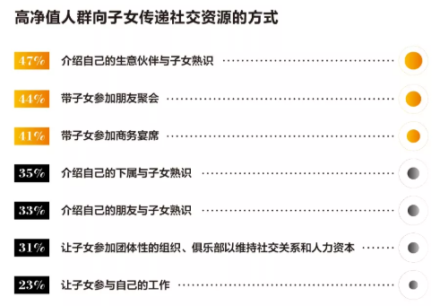 78%的高淨值人群認為自己的社交資源可以為子女在職業發展上起到較大的作用,通過介紹自己的生意夥伴與子女熟悉(47%)、帶子女參加朋友聚會(44%)和宴席(41%)以達到社會關係和人力資本的傳遞;此外,也會通過讓子女參加團體性組織、俱樂部以維持父輩們所建立的社交關係。