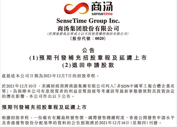 昨日,商湯集團發佈通告稱,公司股票全球發售及集團上市將會延遲,但預期將刊發補充招股章程,並載有更新上市時間表、香港發售股份的相關申請程式及其他相關資料。