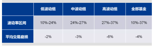 以2014-2019年數據為例,一個關鍵的指標“交易磨損”(=基金淨資產利潤率-基金複權淨值增長率)。交易磨損越高,意味著持有的基民更容易高買低賣,追漲殺跌,導致基民整體實際投資收益率的下降。如果按波動率將基金分為三組,下表顯示,低波動組別的交易損耗顯著低於高波動組別。可見波動率越低,基民交易衝動更低,實際收益率的交易磨損更少。