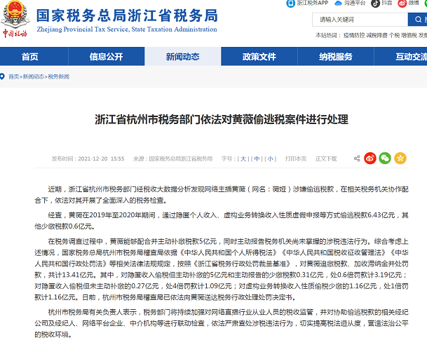 近日,國家稅務總局浙江省稅務局網站12月20日發佈一則通告,主要內容為頭部網路女主播黃薇(網名:薇婭)在2019年至2020年期間,通過隱匿個人收入、虛構業務轉換收入性質虛假申報等方式偷逃稅款6.43億元,其他少繳稅款0.6億元,依法對黃薇作出稅務行政處理處罰決定,追繳稅款、加收滯納金並處罰款共計13.41億元。