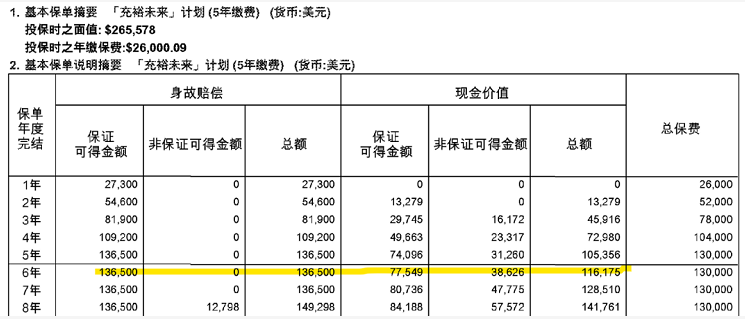 當年的計畫書是這樣的,在第6個保單周年結束時,預計保證可得金額是77549美金,非保證有38626美金,總共有116175美金。因為這份保單本身預計就要8年後才開始超過總保費,所以現在依然在“孵化期”。