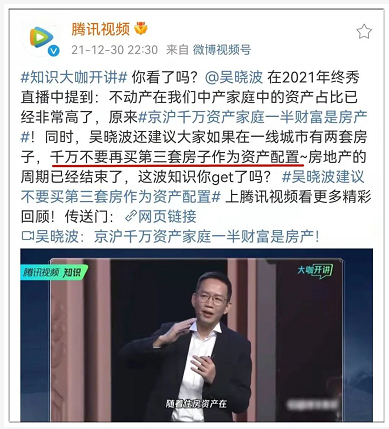 吳曉波講了6個週期,其中對於房地產週期的分析讓很多人受益匪淺,他講到,京滬千萬資產家庭一半財富是房產,這很危險,建議大家如果在一線城市有兩套房子,千萬不要再買第三套房子作為資產配置。