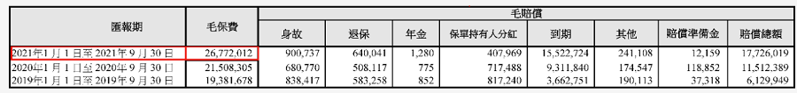 2021年一季度毛保費為106億,二季度毛保費為79億,三季度毛保費為83億澳門元。
