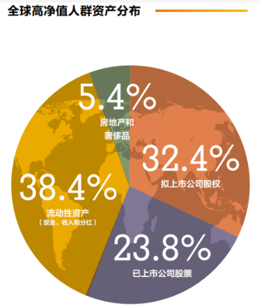 回看 Wealth- X2021年的數據分析,從全球視野來看,在高淨值人群的資產中,除了上市和未上市企業的公司股份兩者總和占比56.2%,剩餘的資產占比中,最大部分的是像現金、分紅、收入之類的流動性資產,比例達38.4%。而常見的房地產與奢侈品等資產僅占總財富的5.4%。