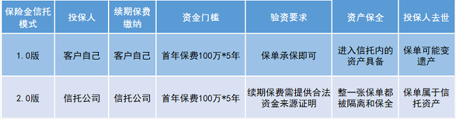 我們來看一下1.0版和2.0版保險金信託的對比表: