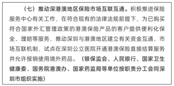 推動深圳與港澳地區建立有關資金互通、市場互聯機制,試點在深圳公立醫院開通港澳保險直接結算服務並允許報銷使用境外藥品。