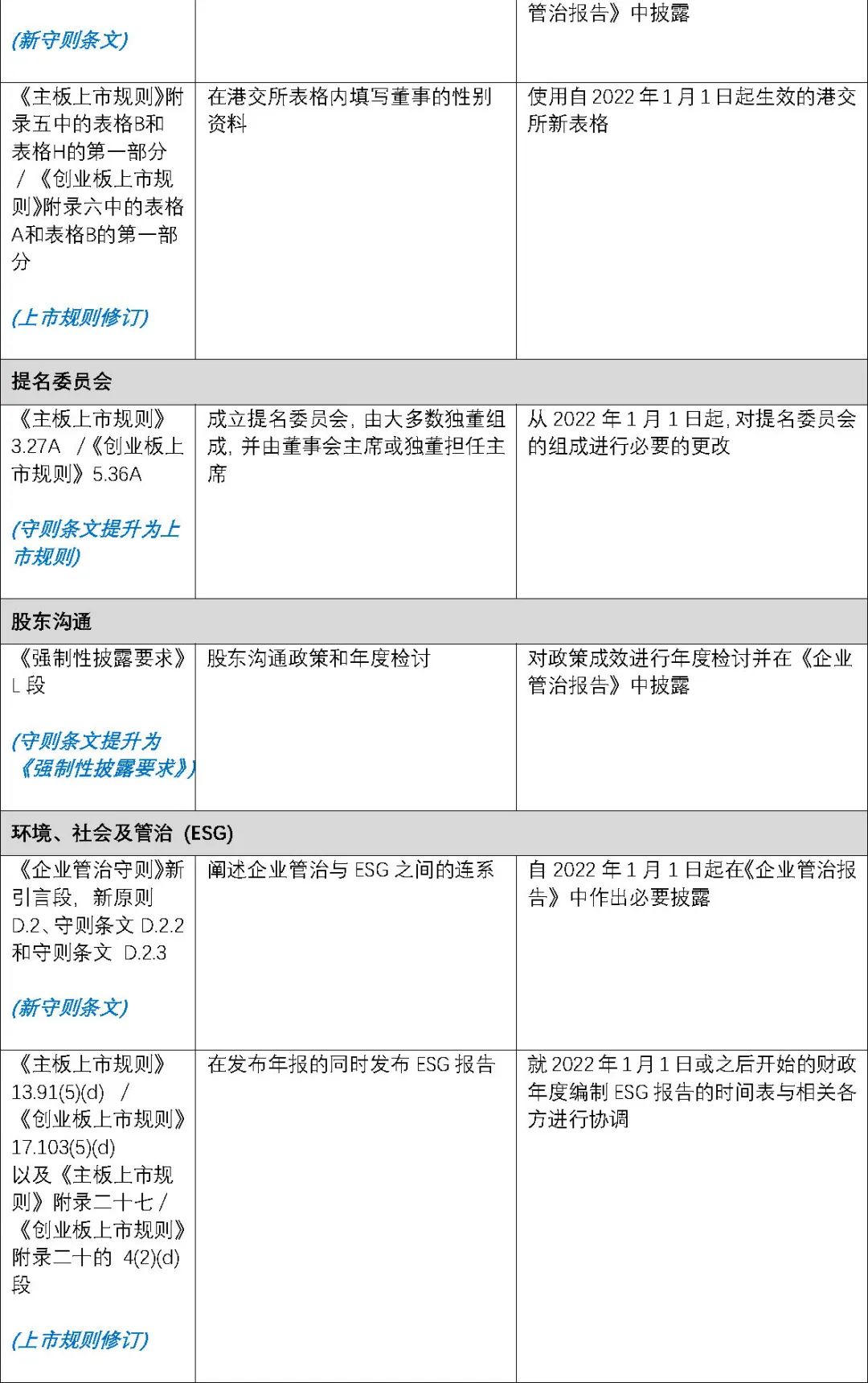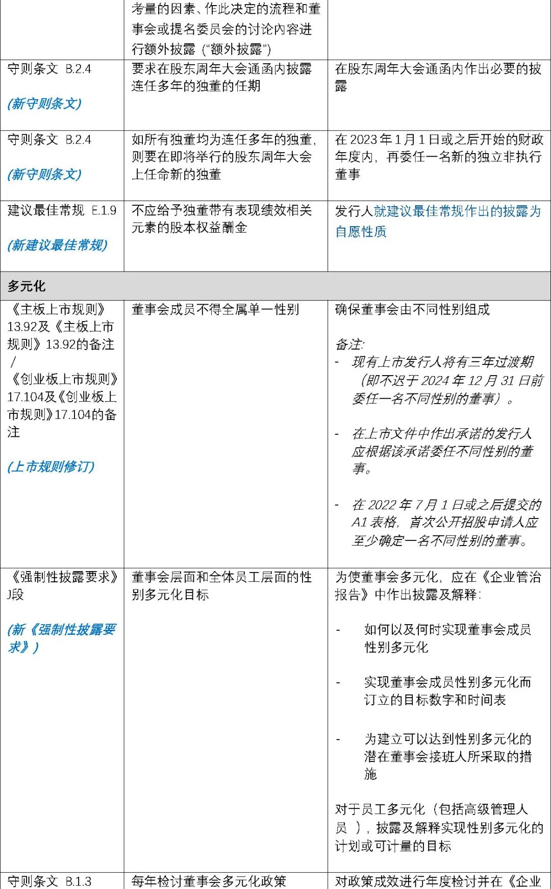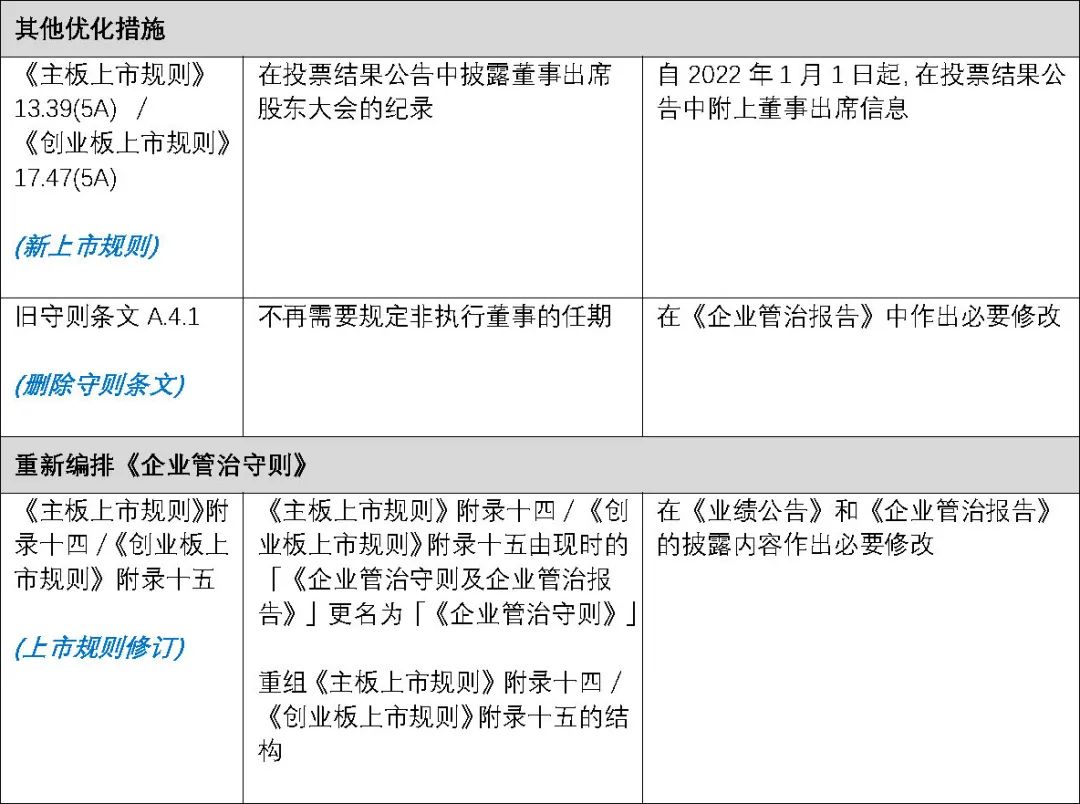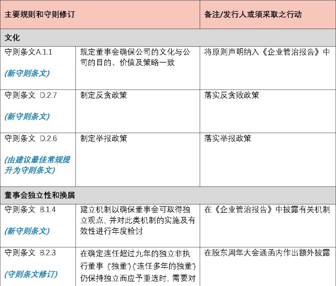 本文並未詳盡,僅重點載列主要的規則和守則修訂。請參閱港交所網站刊登的監管通訊《聯交所刊發有關檢討《企業管治守則》的諮詢總結》、諮詢總結及相關規則和守則修訂。