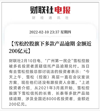 2022年的第一場“雪”就這樣來了,還是熟悉的配方,還是熟悉的味道,頭頂“世界500強”、“廣州第一民企”光環的雪松控股旗下的200億理財產品逾期無法兌付。