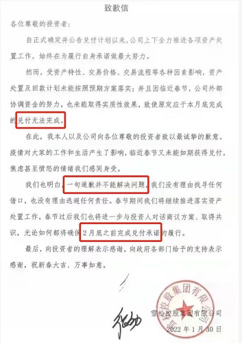 致歉信稱,受各種因素影響,資產處置及回款計畫未能按照預期方案落實,公司外部協調資金的努力,也未能取得實質性效果,致使原本定應於本月底完成的兌付無法完成。