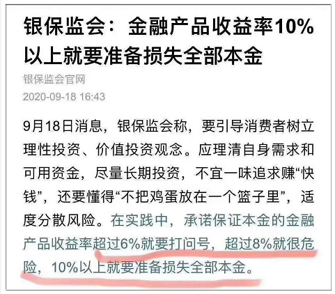 銀保監曾提醒投資者,在實踐中,承諾金融產品收益率超過6%就要打問號,超過8%就很危險,10%以上就要準備損失全部本金。