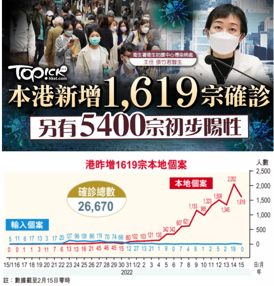 香港新冠病毒疫情愈演愈烈,連續多日確診破千,昨日(15日)公佈新增1619宗確診,5400宗初步陽性。