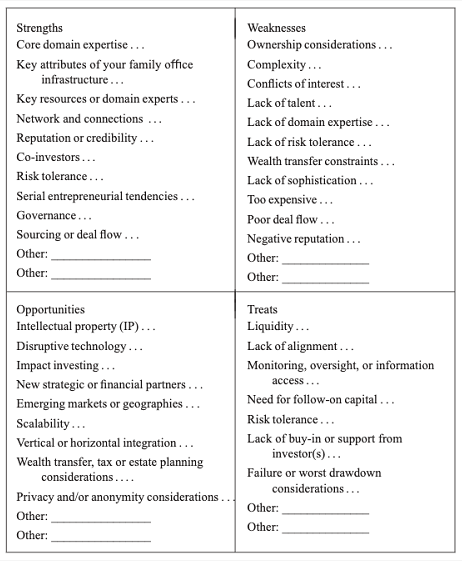 以下是評估家族辦公室做直投的“SWOT分析”範本。